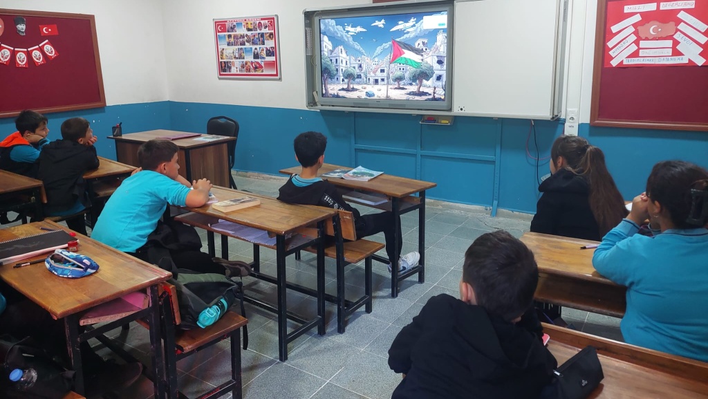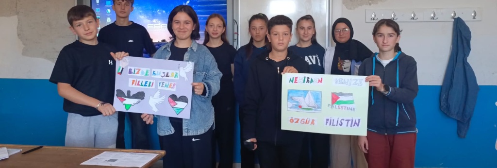 Öğrencilerimizi akademik donanımın yanında barış, demokrasi ve evrensel insan haklarının gerektirdiği ahlâkî sorumluluk bilinciyle yetiştirmektir. İnsan hakları ihlallerini, savaşı ve hukuksuzluğu durdurma çabasında eğitimcilerin sorumluluğu vardır. Bu nedenle eğitim politikaları, barışın, demokrasinin ve insan haklarının egemen olduğu bir dünya hedefini merkezine koymalıdır. Bu kapsamda, Türkiye Yüzyılı Maarif Modeli temel hak ve hürriyetler perspektifinde koşulsuz insan haklarına saygı, küresel barış ve dünyaya saygı ilkelerini merkeze konumlandırır.07/10/2025 Salı günü öğrencilerimizle beraber Filistin Farkındalık Etkinliği gerçekleştirdik.